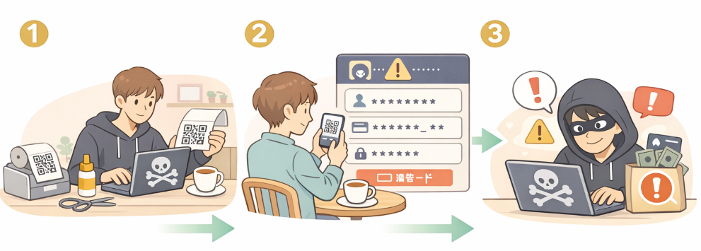 店舗の正規QRコードを偽のQRコードに置き換え、顧客がスキャンすると本物そっくりの偽サイトに誘導され、